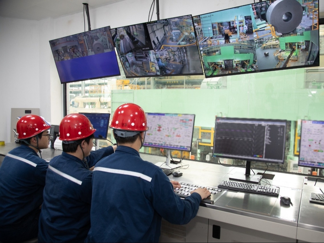 (工程师们操作设备,查看硅钢自动化生产线情况。)