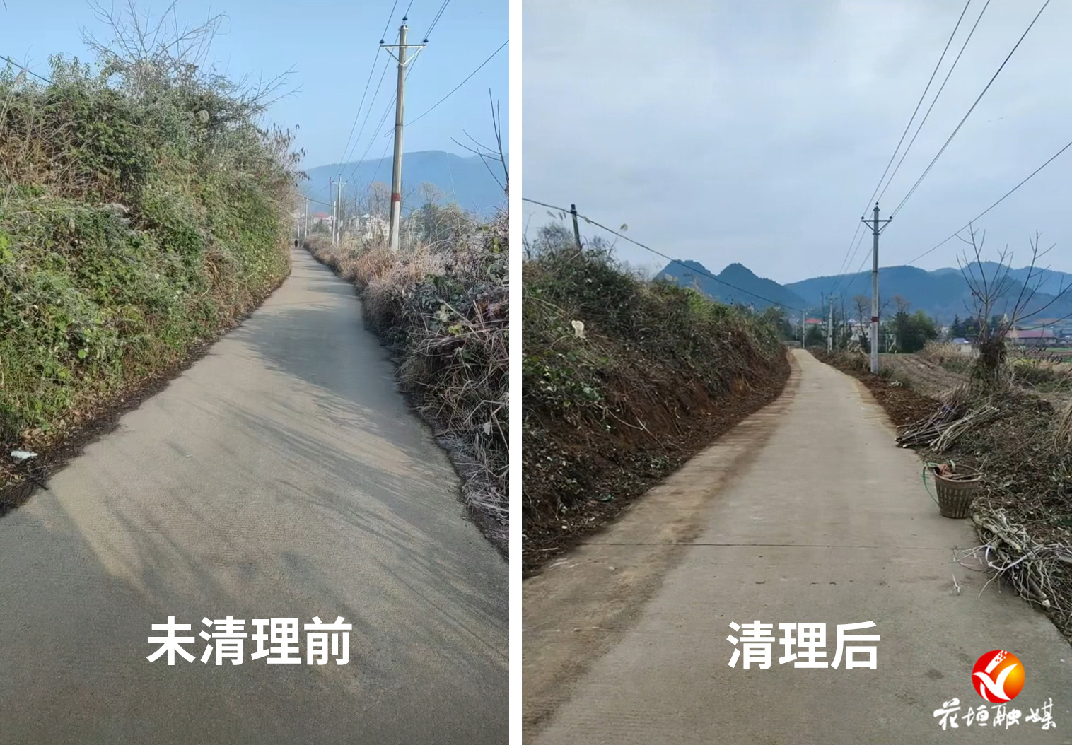 视频里的一幕幕透着质朴的暖意:老人、青少年都在劳动队伍里。镰刀割开密实的枯枝杂草,电动割草机斩断长出路面的藤蔓,竹扫帚与铁锹一点点清理掉村道两旁经年累积的泥土,清理后的路面最宽处比原来多出了将近40厘米。