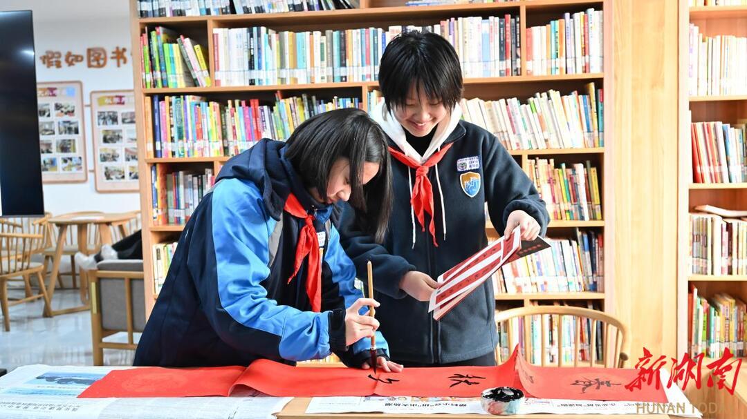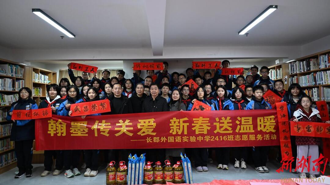 湖南日报·新湖南客户端2月2日讯(通讯员 徐非池)为传承中华优秀传统文化,丰富青少年精神文化生活,引导青少年在笔墨书香中感受传统节日魅力,近日,长郡外国语实验中学2416班在长沙市天心区先锋街道尚双塘社区开展“翰墨传关爱·新春送温暖”志愿服务活动,同学们以笔为媒、以墨传情,将马年的美好期许融入笔墨丹青,为社区老年人送上新春问候。
