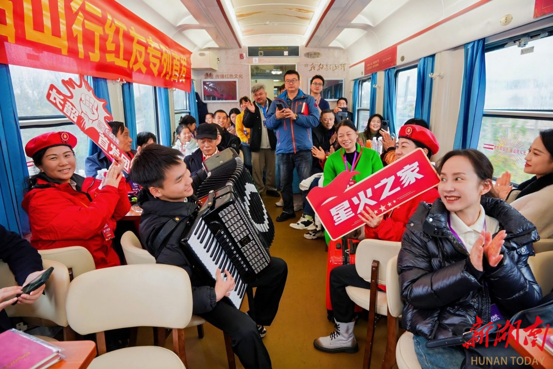 红友在“韶山行”专列上自发合唱革命歌曲。