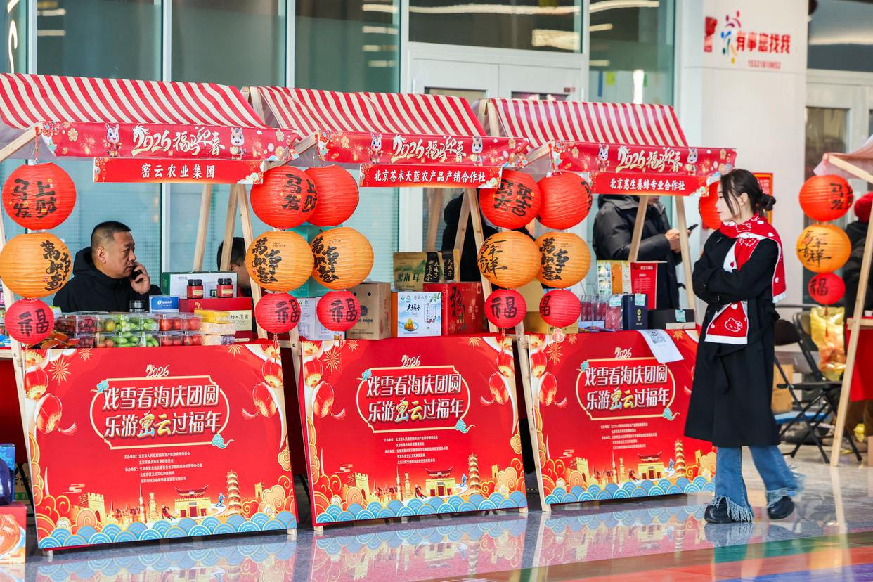 除朝阳站地区以外,北京西站地区、北京丰台站地区的市集将于2月4日立春当天开集。在北京西站地区,“京企直卖”平台精选非遗老字号年货,旅客扫码即可进入新春年货专区,选定点心、特产、文创等商品后,直接填写邮寄地址就能享受邮寄到家服务。北京丰台站交通枢纽内,除了老字号年货外,2月10日(腊月二十三)至3月3日(正月十五)期间,陆续组织开展灶糖制作、窗花DIY、石磨体验、非遗面塑等各类民俗展示活动。