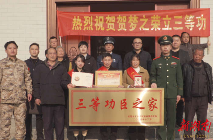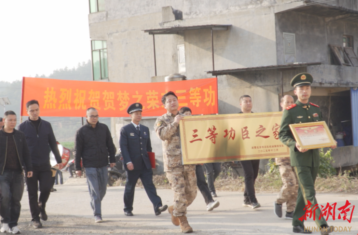 湖南日报·新湖南客户端2月4日讯(通讯员 段智勤 记者 刘韵霞)日前,茶陵县人武部、县退役军人事务局联合枣市镇政府来到曹柏村,为荣立个人三等功的现役军人贺梦之送达立功喜报与奖励金,为其家属佩戴荣誉绶带。同时,部队还送来了“三等功臣之家”荣誉牌匾,邻里乡亲纷纷驻足见证这份荣光,共同向军人军属致以崇高敬意。