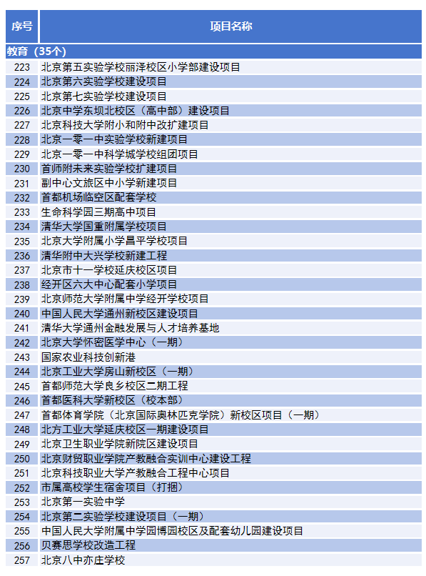 35个教育项目中,涵盖了17个新建教育项目,包括北京第五实验学校、北京第六实验学校、北京第七实验学校。