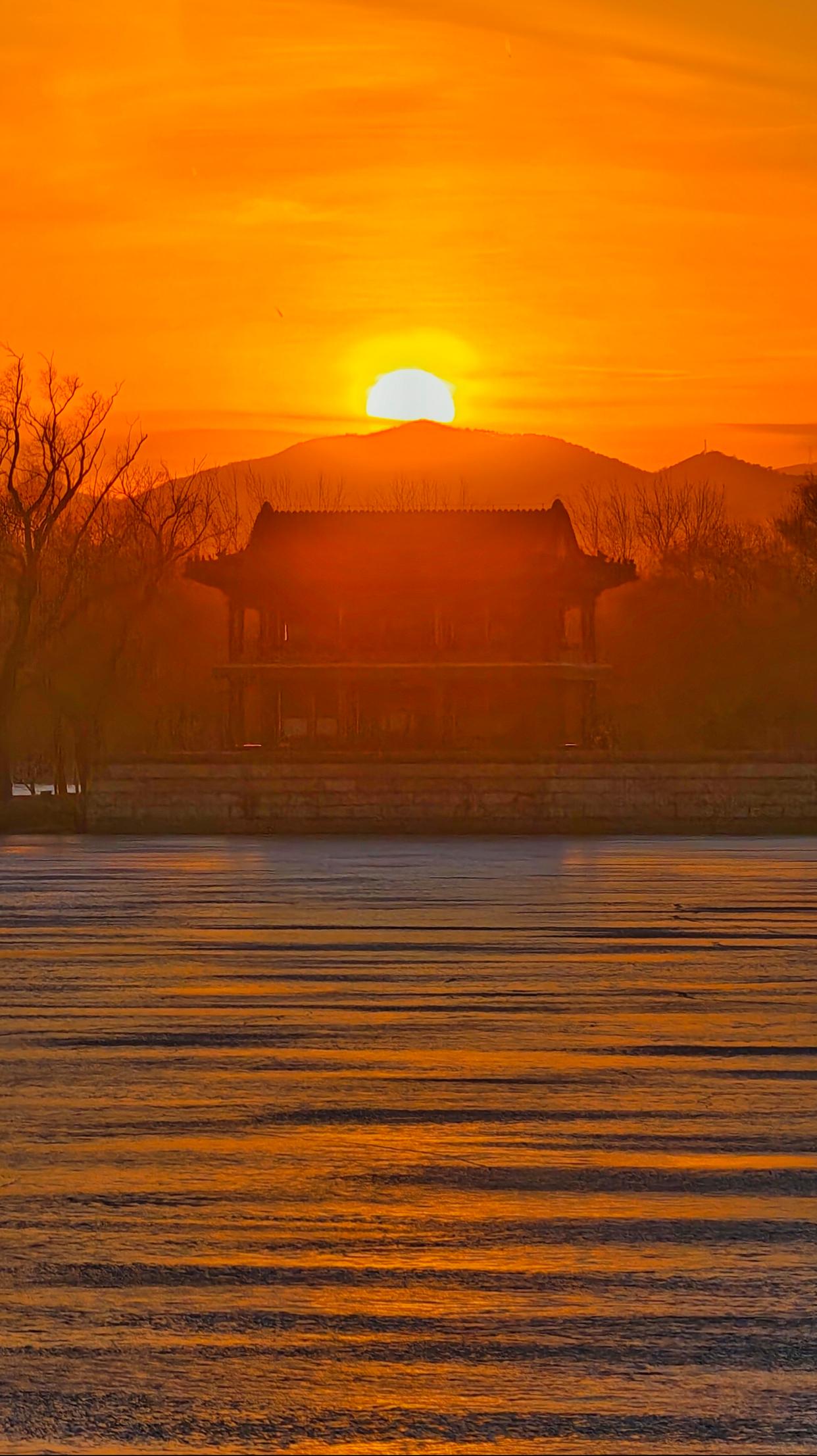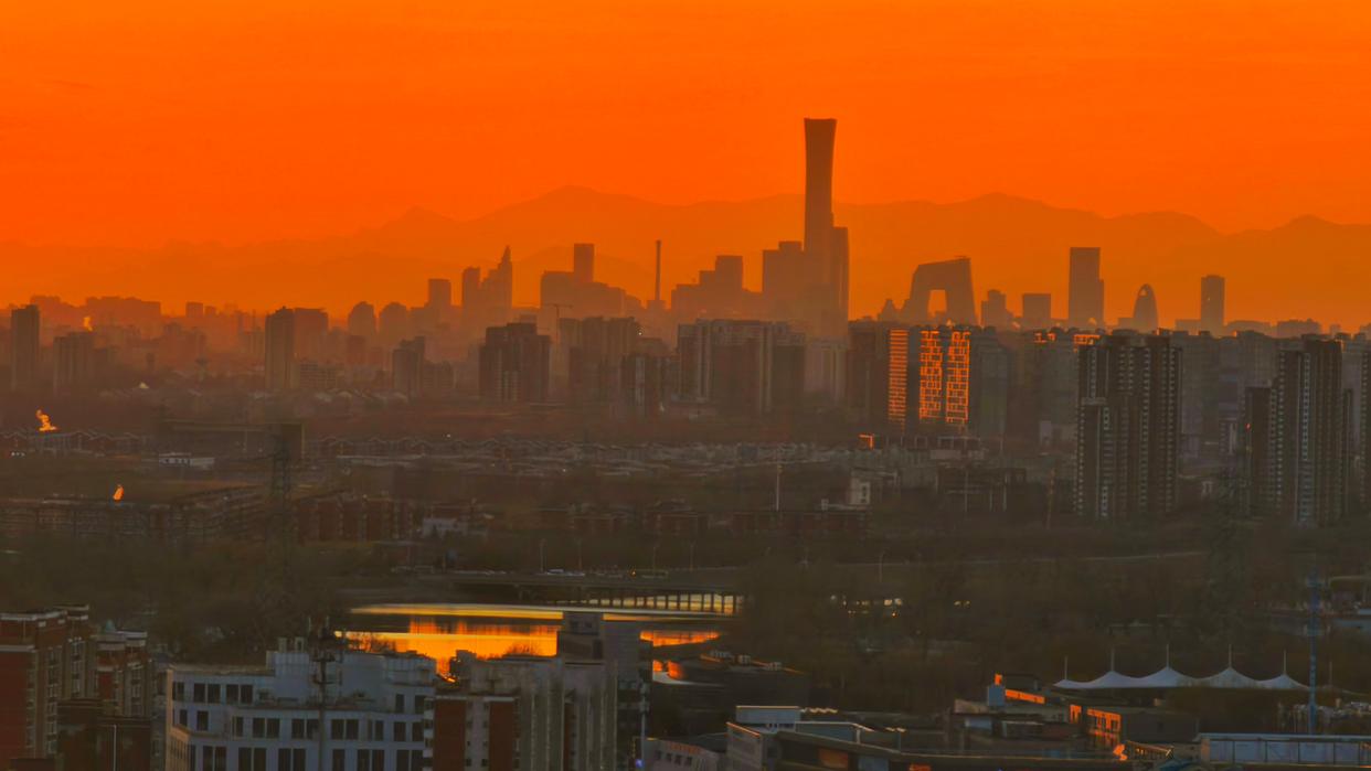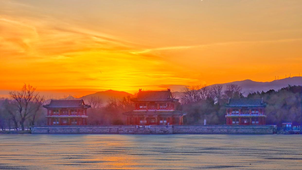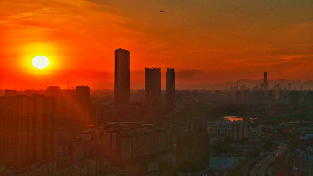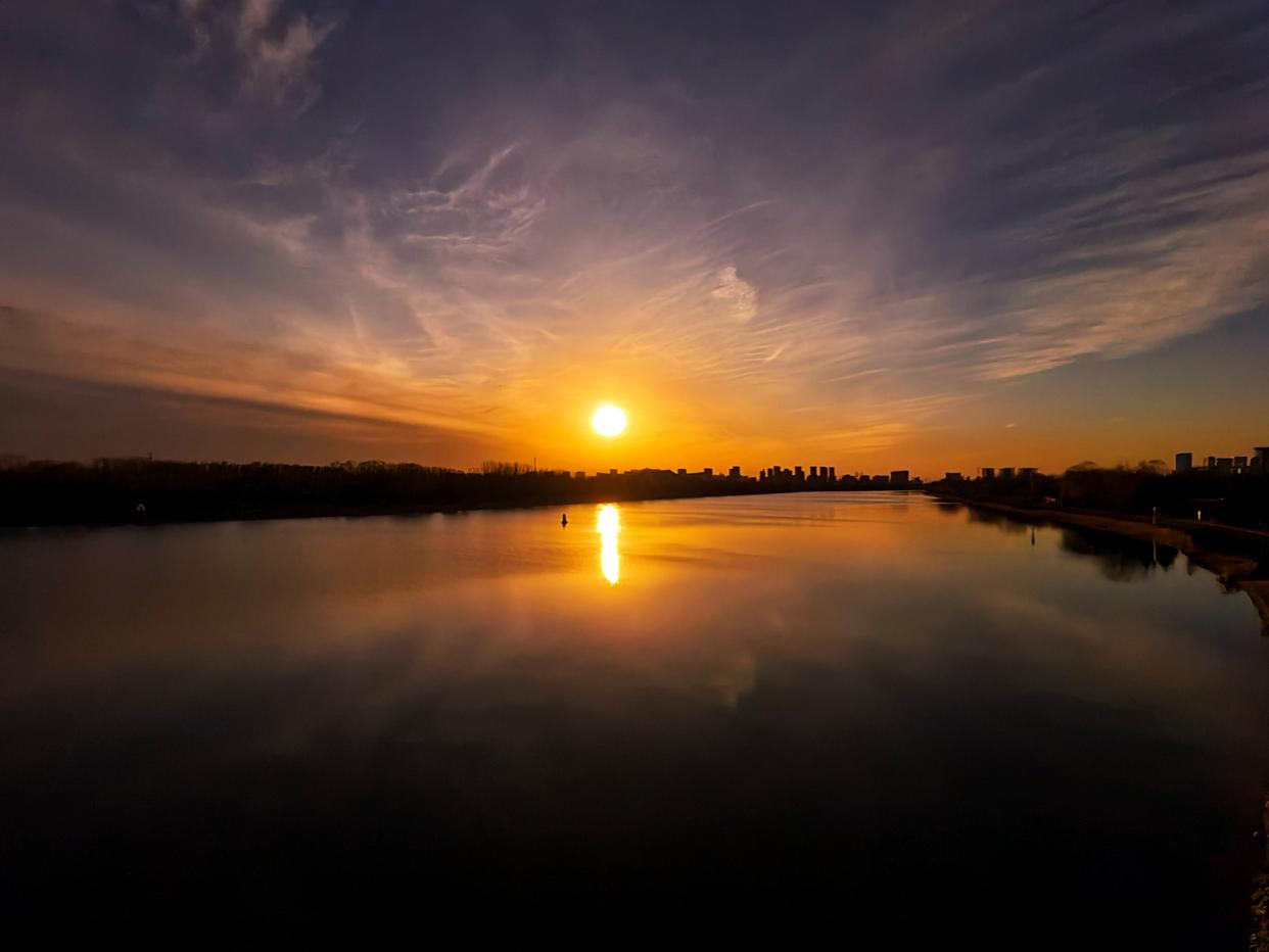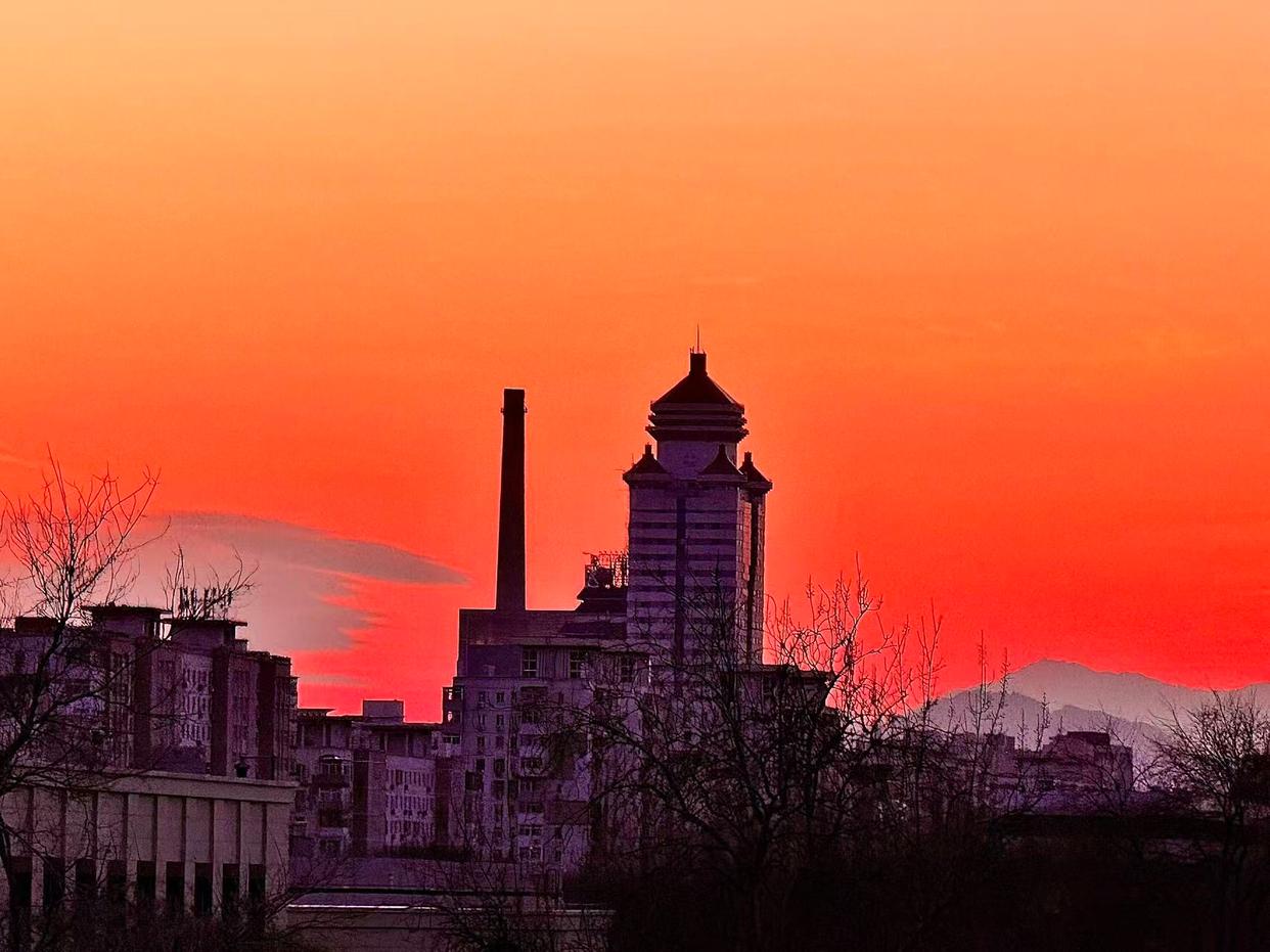 2月5日傍晚,北京,夕阳如约而至,晚霞仿佛绸缎般流动,天空被橙色霞光铺满,美不胜收。
