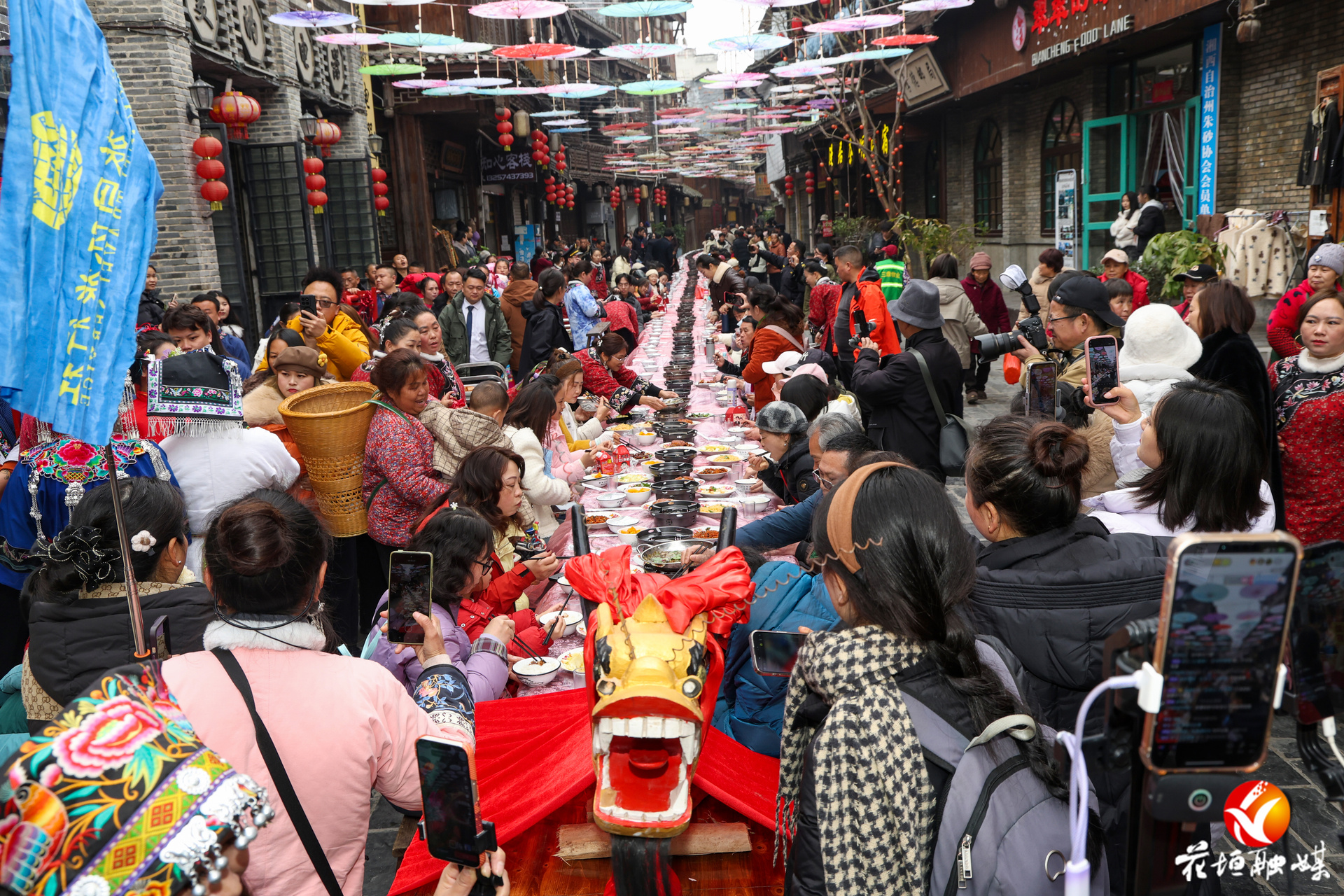 正午时分,东方红伞街上的“苗家长龙宴”如约开席,近百张木桌首尾相连、蜿蜒如龙,成为街头一道别样风景。苗家腊肉、角角鱼、糯米酒等特色美食摆满餐桌,诱人香气扑面而来。