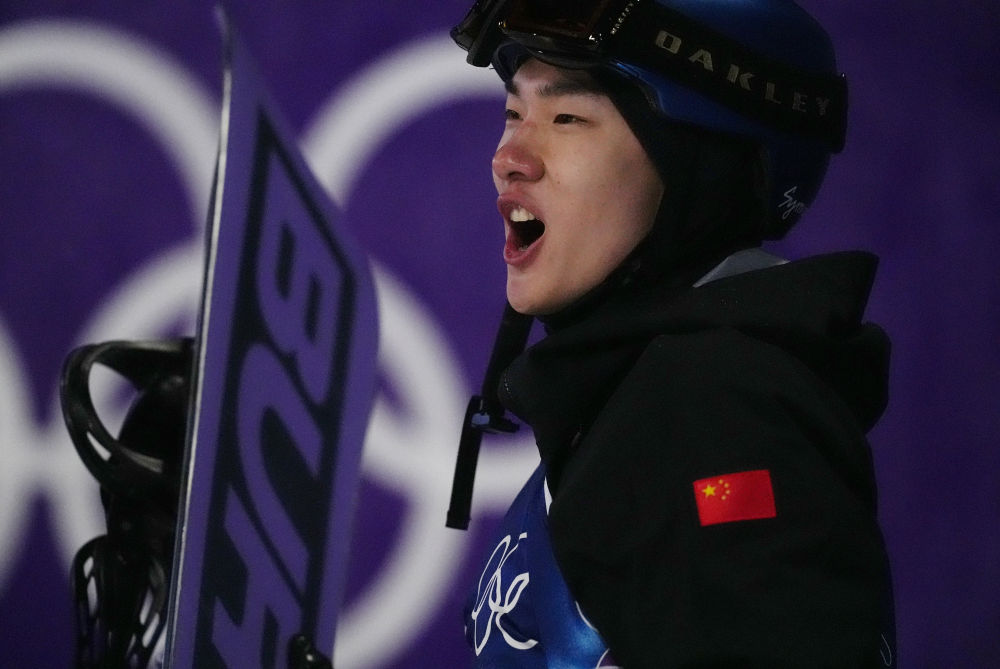 2月5日,苏翊鸣在第三跳后庆祝。新华社记者 邬惠我 摄