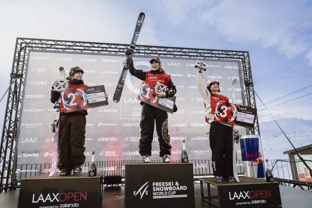 2026年1月17日,在瑞士莱克斯举行的国际雪联世界杯系列赛中获得女子自由式滑雪坡面障碍技巧冠军的谷爱凌(中)在领奖台上。新华社发(马塞尔·莱默希特 摄)