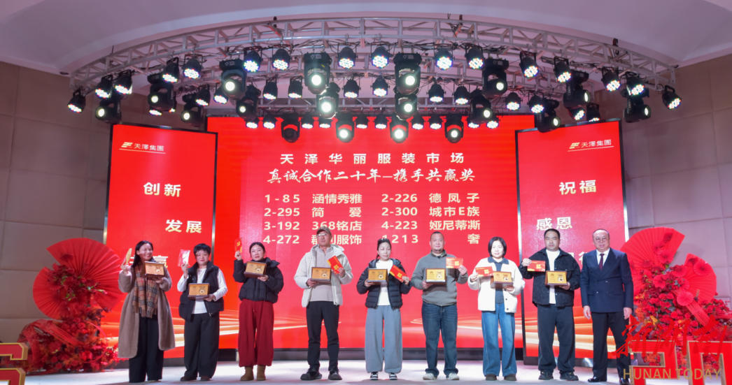 2月7日,湖南天泽商业集团有限公司举行2026新春答谢会,发布入选“2025国家治理创新经验(企业治理)十大典型案例”的《服饰产业数实融合的“天泽华丽”实践》成果,对天泽华丽服装批发大市场2025年度诚信经营户、文明经营户、数实融合示范经营户等48名优秀商户进行表彰嘉奖。