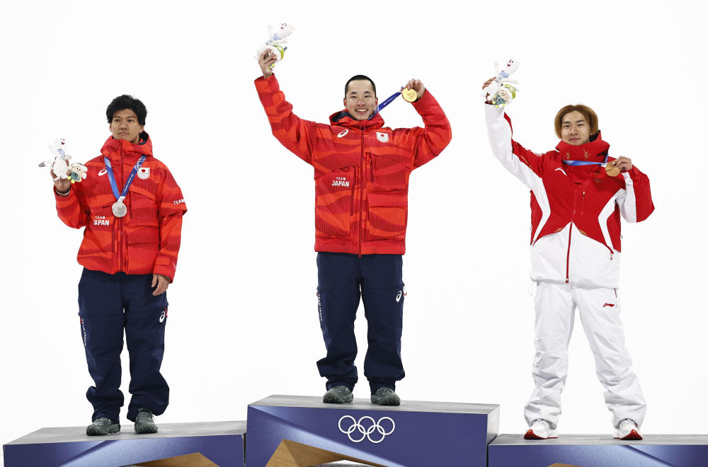 2月7日,冠军日本选手木村葵来(中)、亚军日本选手木俣椋真(左)和季军中国选手苏翊鸣在颁奖仪式上。新华社记者 王鹏 摄