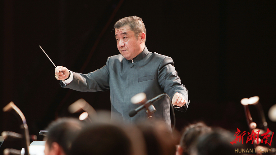 唢呐独奏《戏说乾元宫》,是以长沙特有的弹词为基调,仿俗语方言作谐音,把火宫殿、 乾元宫叫得响响;把红烧肉、臭豆腐喊得甜甜。之后上演的歌曲《我爱你中国》,是电影《海外赤子》的经典插曲,展现祖国山河壮丽与文化底蕴,表达海外游子对祖国的深情厚谊。二胡协奏《红梅随想曲》诞生于改革开放 初期,体现了当时二胡创作向大型体裁与现代作曲技法探索的时代特征,深刻塑造了女英雄江姐的高大形象。压轴曲目《龙腾虎跃》,描绘了神州大地奋勇前进的壮阔图景,奏响的是新时代的奋进之歌。