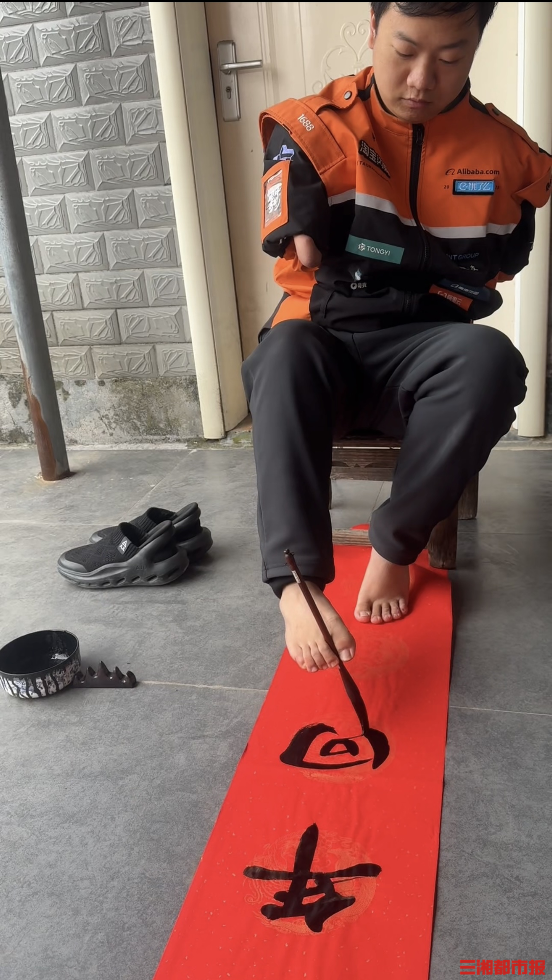 2月9日,湖南怀化,31岁的无臂小哥李向阳踩着独轮车穿梭在街头,送完午餐时间的最后一份外卖,回到家中稍作休息。稍有空闲,他用右脚持笔,挥毫写下新春祝福,字里行间满是对生活的热爱与坚守。