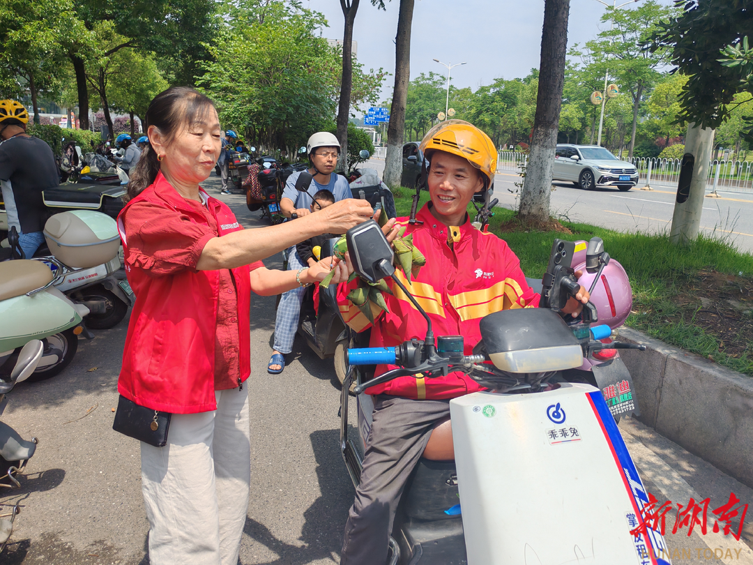流动党员将粽子送到外卖小哥等新就业群体手中。