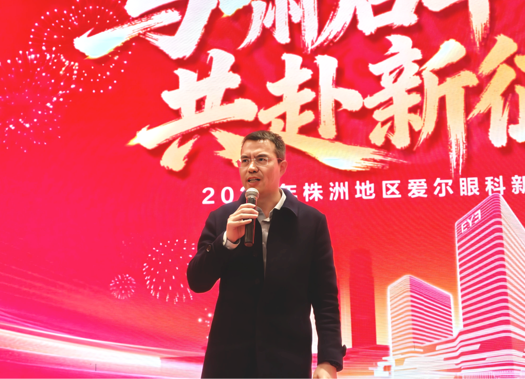 大会伊始,湖南省政协委员、爱尔眼科株洲地区CEO侯爱利致辞,向全体同仁与来宾致以新春问候。他回顾了2025年医院取得的全面发展:各专科协同并进,技术、学术与服务持续优化,在疑难眼病诊治与复杂病例处理上树立良好口碑;主办市级质控会议、眼底病论坛等学术活动,深入开展公益筛查与科普实践,切实履行守护湘中地区群众眼健康社会责任。最后,侯爱利勉励全体,新的一年继续坚持“地县一体”发展核心,凝心聚力,赓续奋斗,共谱发展新篇。