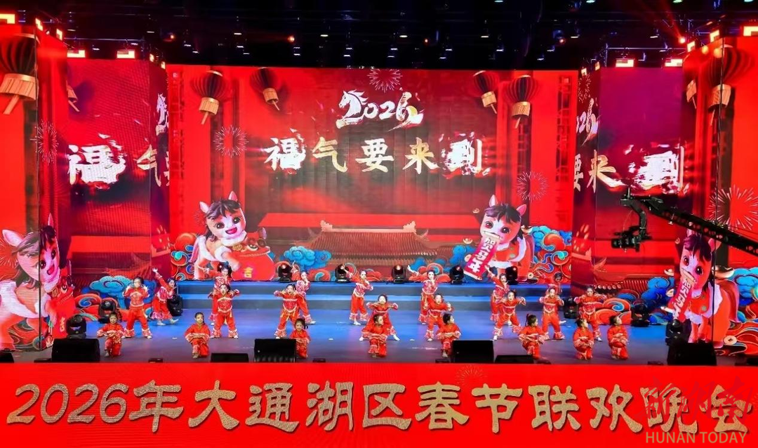 2月11日晚,益阳市大通湖区文体活动中心灯火璀璨、笑声满堂,“万马奔腾 福满人间”2026年大通湖区春节联欢晚会精彩上演。晚会汇聚歌舞、曲艺、快板及情景剧等多种艺术形式,精心编排节目,群众积极参与。本次活动采用线上线下同步呈现的方式,为全区党员干部群众奉献了一场精彩的视听盛宴。
