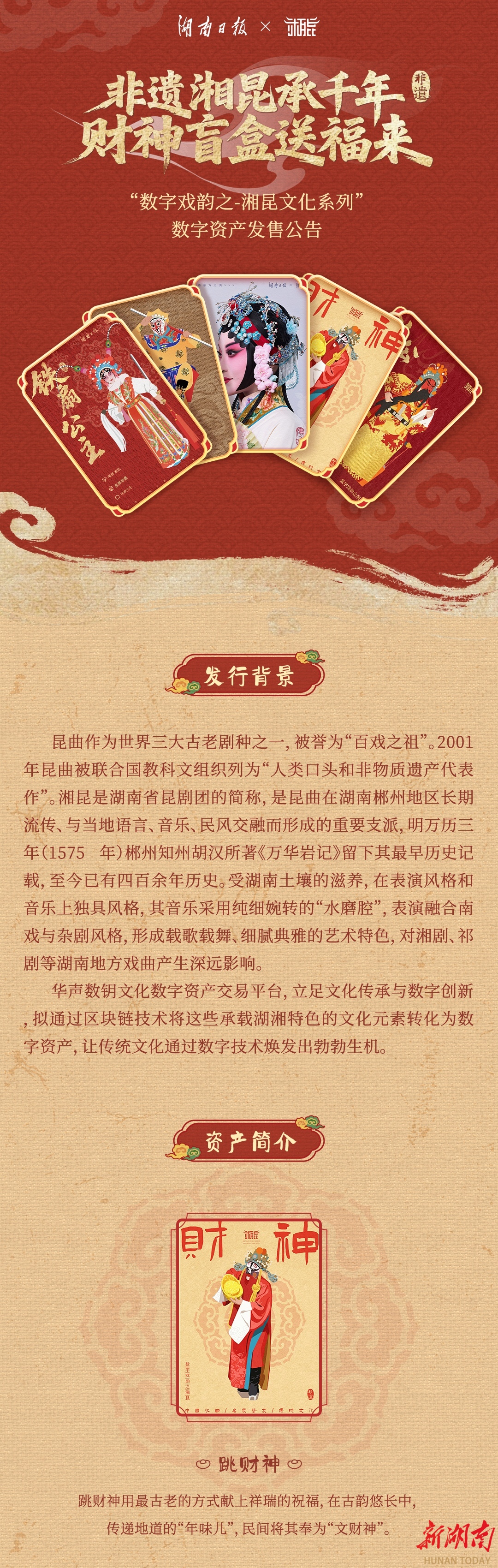 当非遗遇上数字科技,传统文化的传播便有了全新表达。作为湖湘文化瑰宝的湘昆,在华声数钥文化数字资产交易平台以“传统文化+科技赋能”的模式顺利发行。2月11日,农历小年夜,华声数钥平台推出8888份“数字戏韵之湘昆”系列数字盲盒,发售即秒空。