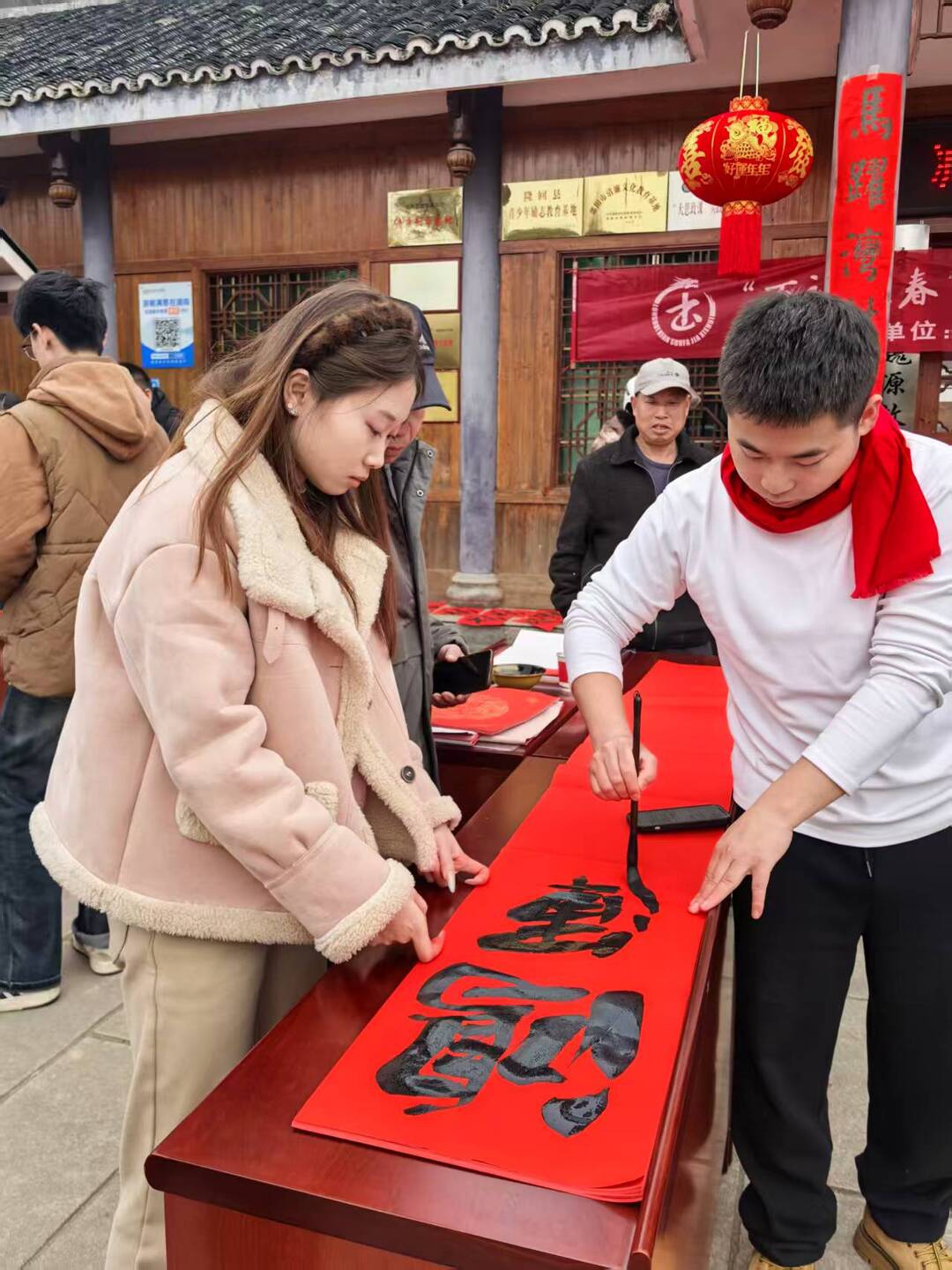 本次活动由隆回县文学艺术界联合会主办,隆回县书法家协会承办,立足魏源故里深厚人文底蕴,将红色党建、传统年俗与乡土文化有机融合,让文化惠民直抵基层、服务群众。活动现场,红幅铺展、墨香四溢,县书法家协会会长率骨干会员,与学堂湾村本土书法爱好者同台挥毫,笔力遒劲、气韵生动。