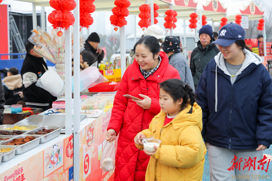 活动现场,小巧的喷花、梦幻的水母烟花吸引着家庭游客。来自长沙的刘先生一家正在挑选手持小烟花:“在城市里很难让孩子这样安全地体验放烟花的乐趣,这里既有年味又有安全保障,特别好。”空气中,还弥漫着醴陵小炒肉的镬气与红薯片、炒米糕的甜香,美食区的灶火正旺,引得食客排队。