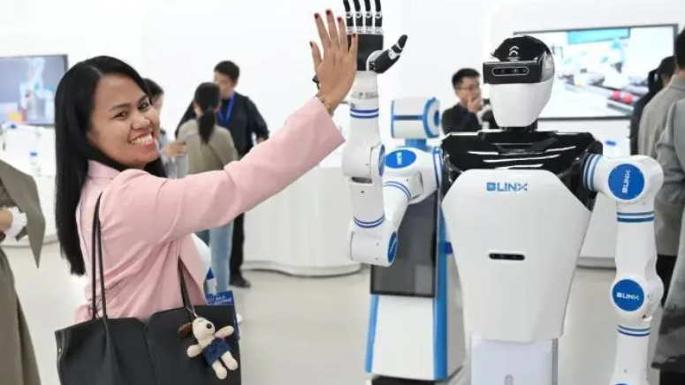在长沙,外媒记者与机器人击掌。——“买买买”的热情奔赴