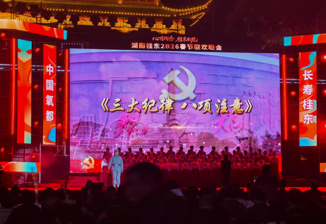 本次晚会亮点纷呈。开场视频《奋蹄迎春·锦绣桂东》率先点燃全场氛围,万洋山云海翻涌如骏马驰骋,青竹村民宿炊烟袅袅,“第一军规广场”红旗猎猎,粤港澳大湾区“菜篮子”基地高山蔬菜青翠欲滴,生动呈现了桂东过去一年“四城建设”的坚实步伐。同步亮相的汇报片《奋进谋发展,实干谱新篇》,进一步展现2025年桂东在生态农业、文旅康养、红色旅游等领域取得的丰硕成果。随后,大合唱《三大纪律八项注意》铿锵登台,将红色记忆与时代豪情深度融合。舞蹈《春节序曲》紧随其后,传递浓浓的新春喜悦,正式拉开晚会序幕。