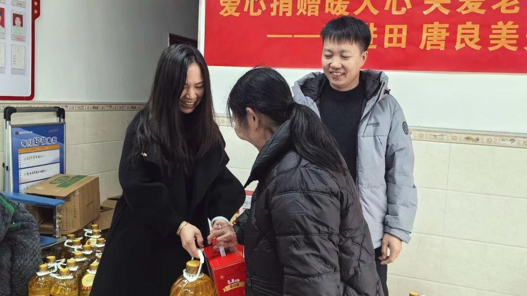 陈家坊镇朱家村村部人头攒动,一桶桶食用油、一箱箱酸奶整齐码放,老人们齐聚一堂、笑容满面,让这个乍暖还寒的冬日涌动着融融暖意。