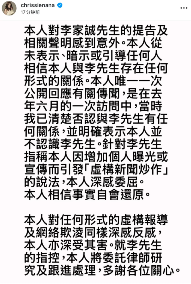 周秀娜2月13日晚,周秀娜在社交平台回应:本人对李家诚先生的提告及相关声明感到意外。本人从未表示、暗示或引导任何人相信本人与李先生存在任何形式的关系。本人唯一一次公开回应有关传闻,是在去年六月的一次访问中,当时我已清楚否认与李先生有任何关系,并明确表示并不认识李先生。