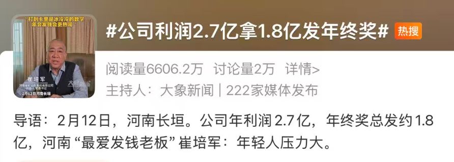 此前,崔培军在接受采访时表示,现场发放超6000万元现金年终奖,加上线上发放部分,集团年终奖总额直接超1.8亿元。去年4000万现场没有发完,今年会将数钱的时间延长,希望6000万现金能发完,钱不够再加。