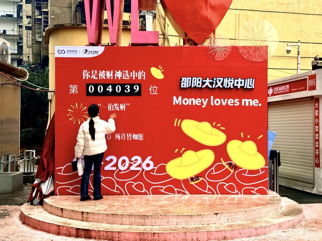 “福气满满”“财神到” 等祝福语跃然红墙之上,金色元宝憨态可掬,数字计数牌实时跳动。“一拍发财”“所许皆如愿”的温暖寄语,吸引市民驻足互动、合影祈福。