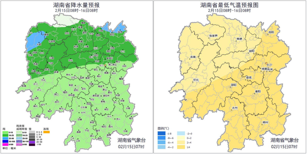 15日白天至晚上,湘西州北部、张家界、常德北部、益阳北部、岳阳北部阴天有中等阵雨或雷阵雨,局地大雨,其他地区多云转阵雨或雷阵雨,16日早晨湘西北高海拔地区有雨夹雪;南风2~3级转北风4~5级,阵风7~9级;最低气温湘南7~10℃,湘北2~4℃,其他地区4~7℃;最高气温湘中以南25~28℃,湘西北16~19℃,其他地区20~25℃。