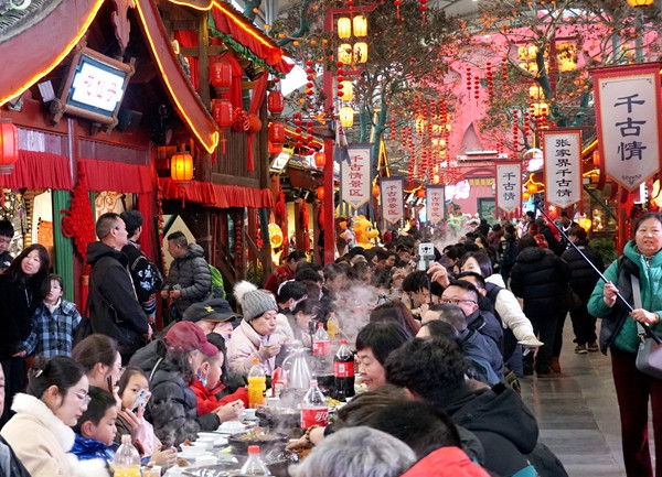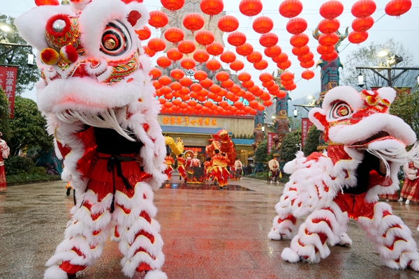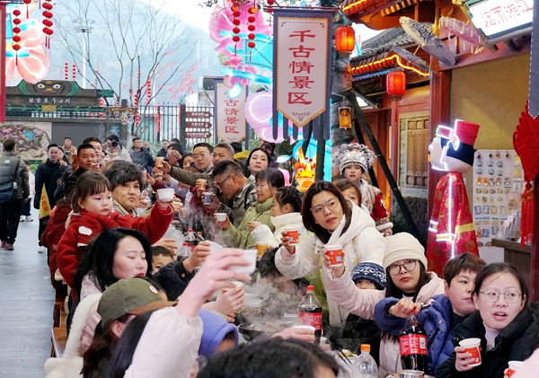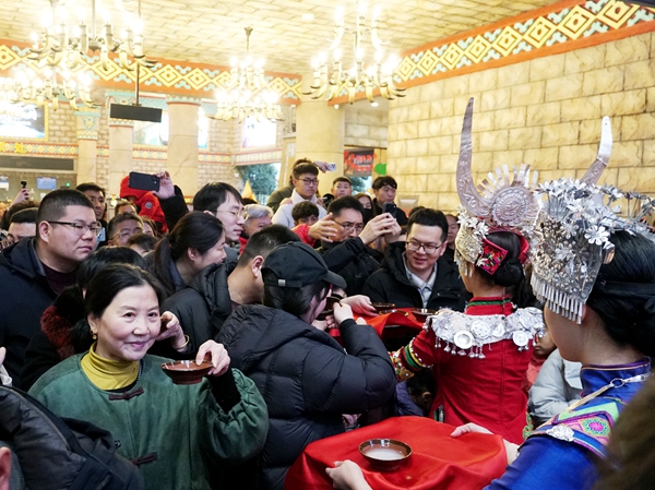 上午8时30分,张家界千古情景区入口已是锣鼓喧天、人声鼎沸。伴着欢快激昂的鼓点,祥龙与雄狮翻腾起舞,瞬间点燃全场热情。500余名市民游客循着浓浓年味而来,在土家阿哥阿妹的热情引导下,接过伴手礼,再饮下一碗拦门酒,刚踏入景区便感受到扑面而来的淳朴与热忱。