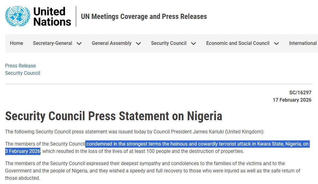 △2月17日,联合国安理会发布新闻声明,以最强烈措辞谴责尼日利亚发生的致超百人死亡的恐袭事件。