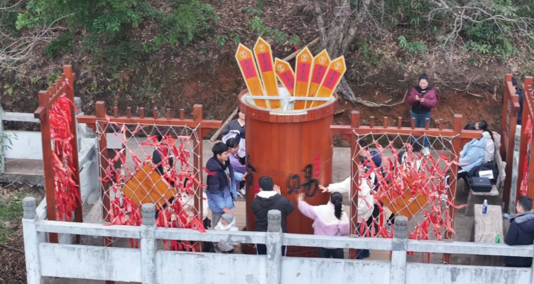 为让游客的祈福之旅更具仪式感,八角寨景区特别推出“舜帝赐福”新春活动,乘坐索道上山的游客均可获赠“舜帝赐福”许愿带,为家人亲友祈愿平安健康、万事顺遂。现场同步推出挑“大柴”、迎“活财”等特色体验,寓意新年红火兴旺、财源滚滚,吸引众多游客踊跃参与,现场欢声笑语不断,年味十足。