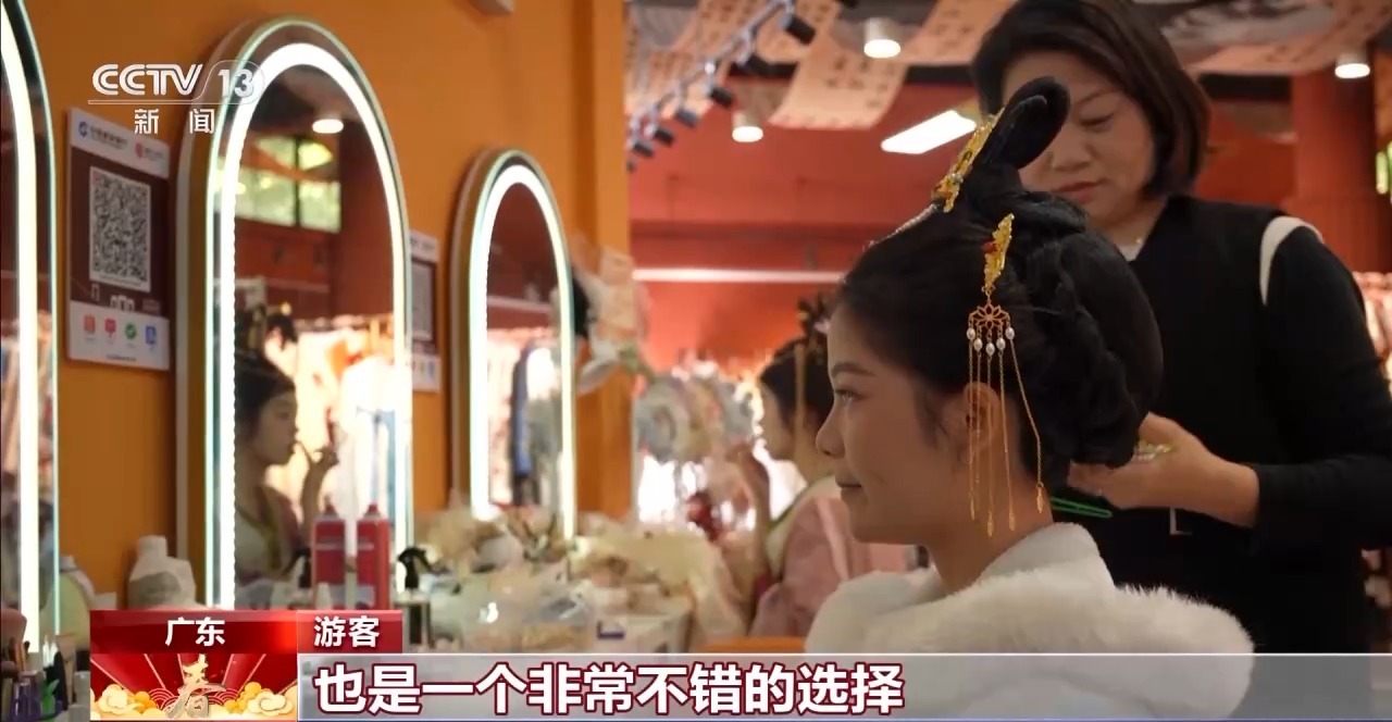 汉服出租经营户:假期期间每天都有几百个客人过来化妆,特别是年轻的女孩子。穿上古代的服装就好像穿越了,还能偶遇到剧组当个群演,挺开心的。