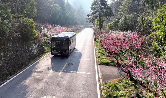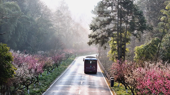 漫步黄石寨梅园,远山如黛,梅花或疏影横斜,或繁花满枝,暗香浮动,沁人心脾。青山为底,繁花为饰,传统水墨意境与鲜活春日生机完美交融,一步一景,美不胜收。景区环保车穿梭于花海与峰林之间,载着八方游客穿行于如画景致中,车轮轻转,花香拂面,勾勒出动静相宜的绝美画面。