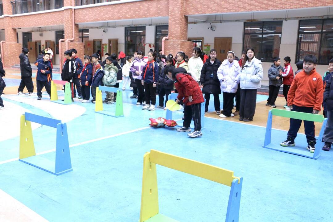 小操场上,“吉量归厩·扇风越障”和“吉量逐冰·壶心夺彩”更是欢声不断。孩子们用扇子将“气球马”扇过障碍物,推进“马厩”;旱地冰壶区域,大家屏息凝神,瞄准圆心奋力一推。体育老师胡铭科介绍:“游戏设计融合了‘神马奔跑’的意象,既锻炼身体协调性,又让孩子们在竞技中感受民俗乐趣。”