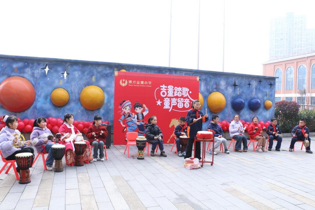 旁边的星球广场则是“吉量踏歌·童声留音”区域,孩子们拿起铃鼓、沙锤、木鱼等小乐器,跟着民歌音频即兴伴奏。音乐老师黄曼琴穿梭其中,不时俯身指导:“对,这里可以轻一点,像春雨沙沙。”稚嫩的器乐声与童声交织,奏出校园里最美的春之序曲。