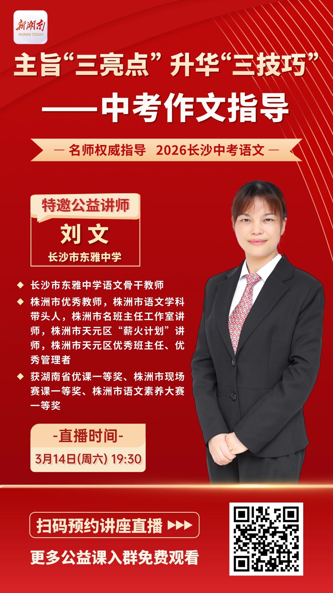 为切实帮助广大初三学生有效提升写作能力、精准把握中考作文得分要点,长沙市东雅中学语文骨干教师刘文将于3月14日(周六)19:30做客新湖南新教育频道直播平台,带来题为《主旨“三亮点”,升华“三技巧”》的中考作文专题公益讲座。讲座将围绕中考作文的核心要求,系统讲解写作思路与技巧,助力学生理清表达逻辑、提升语言表达水平,实现语文成绩的有效突破。