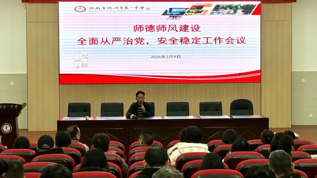 为深入贯彻党的教育方针,全面落实立德树人根本任务,株洲市第一中学于3月9日召开全体教职工大会,围绕师德师风建设、全面从严治党与校园安全稳定三大主题,统一思想、压实责任,凝聚推动学校高质量发展的共识与合力。会议由校长熊鹰主持。