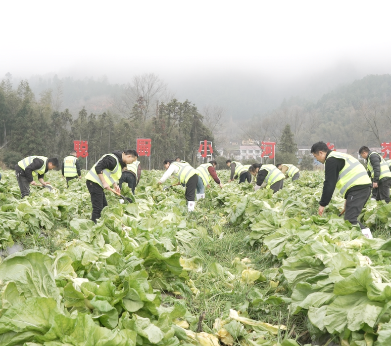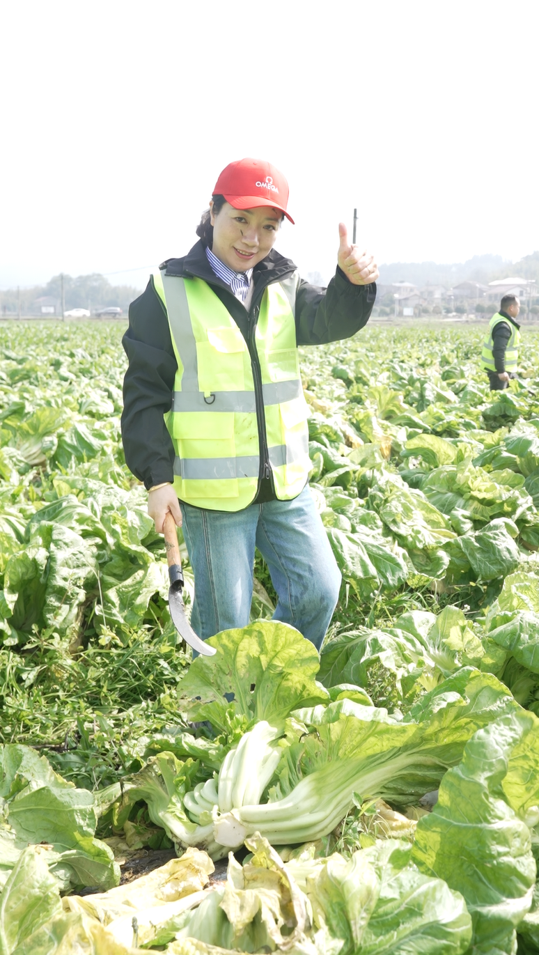 活动当日清晨,聪厨的员工代表们便来到了小河乡乌石村的芥菜基地。他们的第一课,是向当地经验丰富的农户学习如何收割芥菜。在老师的指导下,这些平日与厨具、生产线打交道的“学生”们,笨拙却认真地挥动农具,体验着从土地获取最原始馈赠的过程。随后,员工与农户结对,分组进行采收与搬运。