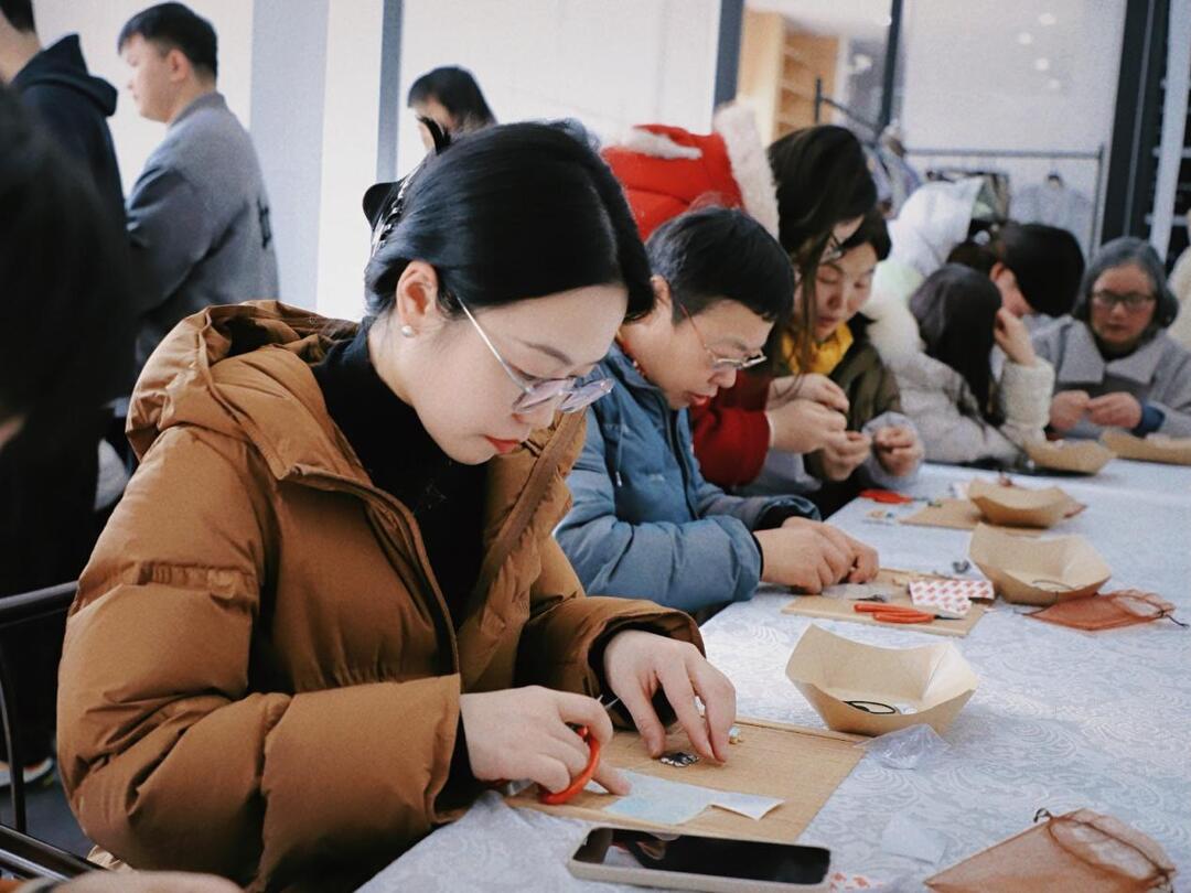 在老师的示范指导下,大家纷纷动手制作宋锦胸针:挑选纹样、剪裁面料、固定镶边、搭配配饰,专注投入、巧手创作,现场交流分享、笑语不断。一枚枚融合古典纹样与现代审美、兼具质感与寓意的宋锦胸针陆续完成,成为专属节日信物。