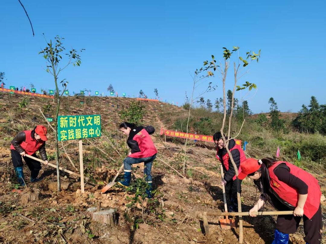 位于该县金石镇杨柳田村的植树活动现场,红旗飘扬,“履行植树义务,共建美丽新宁”的横幅格外醒目。参与人员分工协作,挥锹铲土、扶苗填坑、提水浇灌,每一道工序都一丝不苟,现场一派热火朝天的劳动景象。经过辛勤劳作,原本空旷的山坡上,一株株桂花、栾树、杜英迎风挺立、错落有致,为初春的新宁大地注入了勃勃生机。
