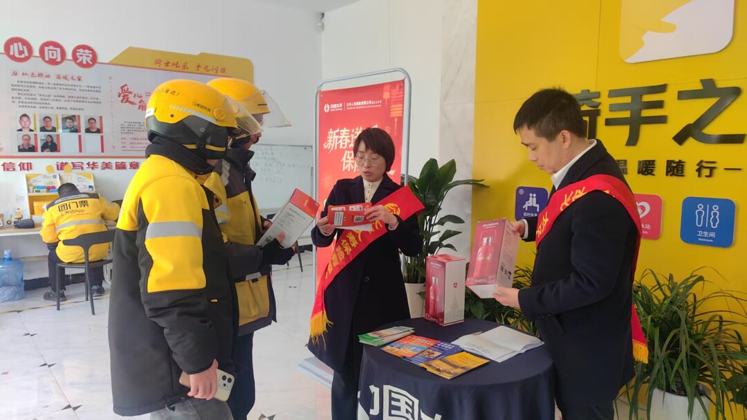 太平人寿工作人员为村民、外卖员等群体进行金融知识宣传。