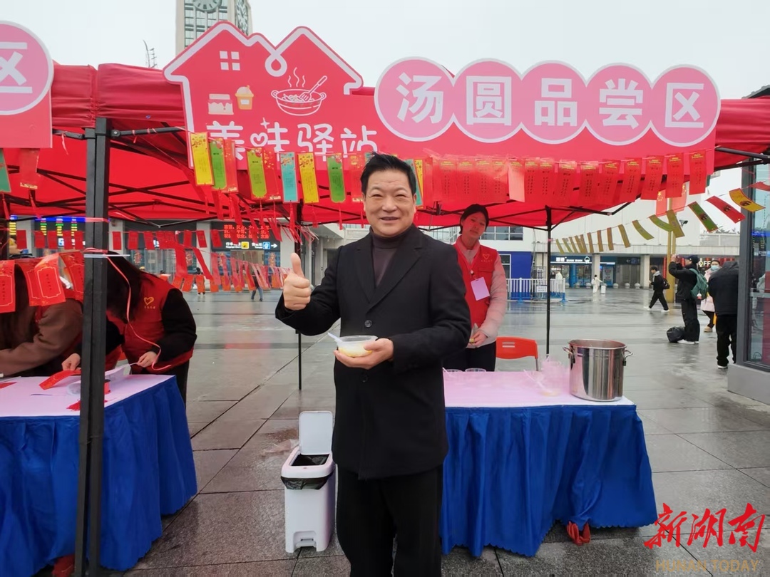元宵节旅客在火车站广场免费品尝汤圆。
