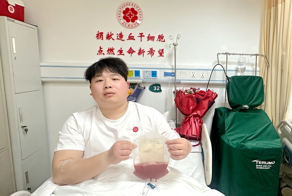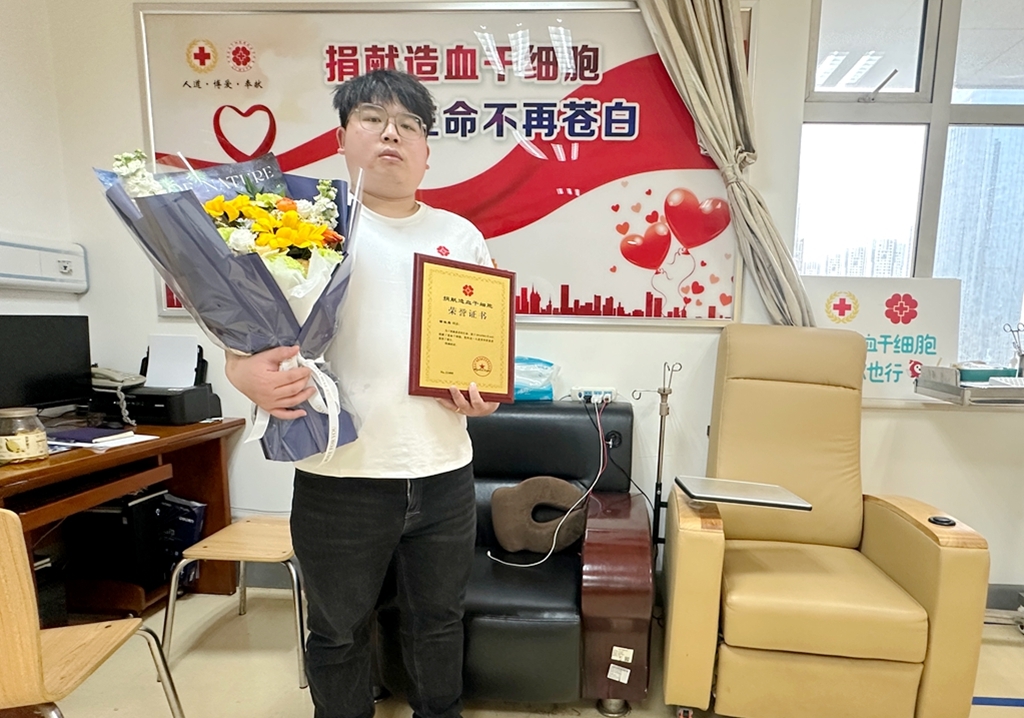 成功捐献造血干细胞志愿者手捧鲜花和荣誉证书 (彭天冰摄)