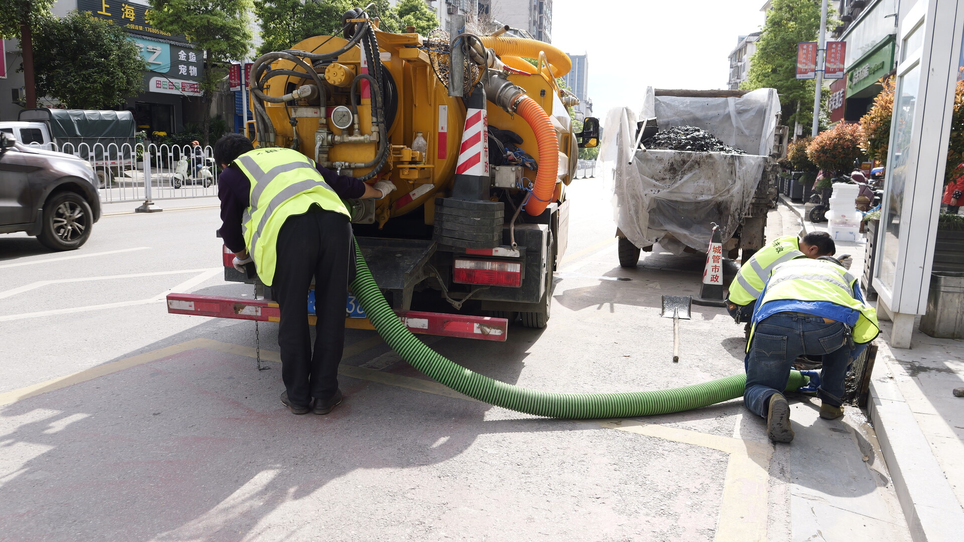 在文明路作业现场,市政作业人员手持铁锹、火钳等工具,逐一撬开雨水口,对雨水口淤积的淤泥、枯枝落叶、生活垃圾进行细致清掏,再通过高压水枪对管网深处进行反复冲刷、彻底疏通,全流程保障管网无堵塞、排水无阻碍。当日累计完成管网检修33处,清理淤泥、各类杂物约9吨,有效恢复并提升了县城主干道的排水功能。