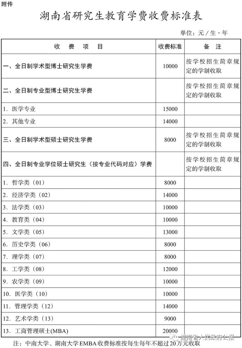 根据财政部、国家发展改革委、教育部《关于完善研究生教育投入机制的意见》(财教〔2013〕19号),国家发展改革委、财政部、教育部《关于加强研究生教育学费标准管理及有关问题的通知》(发改价格〔2013〕887号)和《教育部办公厅关于统筹全日制和非全日制研究生管理工作的通知》(教研厅〔2016〕2号)的规定,为规范我省研究生教育收费,促进高等教育事业持续健康发展,现就加强我省研究生教育收费管理及有关事项通知如下:一、为维护研究生招生办学秩序和收费水平基本稳定,各高等学校向所有纳入招生计划的全日制学术型和专业型研究生收取的学费仍按原收费标准执行。具体收费标准详见附件。二、非全日制学术型和专业型研究生培养期间收费标准,按照不超过我省现行全日制学术型和专业型大类收费标准与全日制财政生均经常性拨款之和,由各学校根据各专业培养成本、办学水平、学生的经济承受能力自主确定,同时报省发展改革委、省财政厅、省教育厅备案后执行。三、本硕连读、硕博连读、本硕博连读学生的学费标准分别参照执行相应学习阶段的有关收费政策。四、研究生服务性收费和代收费按照现行普通大中专学校服务性收费和代收费有关规定执行。五、研究生住宿费按照现行学生公寓收费管理办法执行。六、考试考务费、论文答辩费、选(重)修课程费按照现行教育系统行政事业性收费有关规定执行。七、经批准实施学分制收费管理的学校,可继续实行学分制收费管理,但学分制收费总额不得高于学年制收费总额。八、研究生收费实行“新生新办法,老生老办法”的原则。各高等院校应严格按学年收取学费,不得跨学年预收学费,除本通知规定外,各高校不得擅自设立收费项目或提高收费标准,严禁任何名义的违规收费。九、各高等院校接此通知后,应按规定将收费项目和收费标准进行公示,并使用财政部门统一印制的非税收入票据,自觉接受社会的监督和相关部门的检查。十、本通知自2023年新生入学起执行,有效期2年。湖南省发展和改革委员会