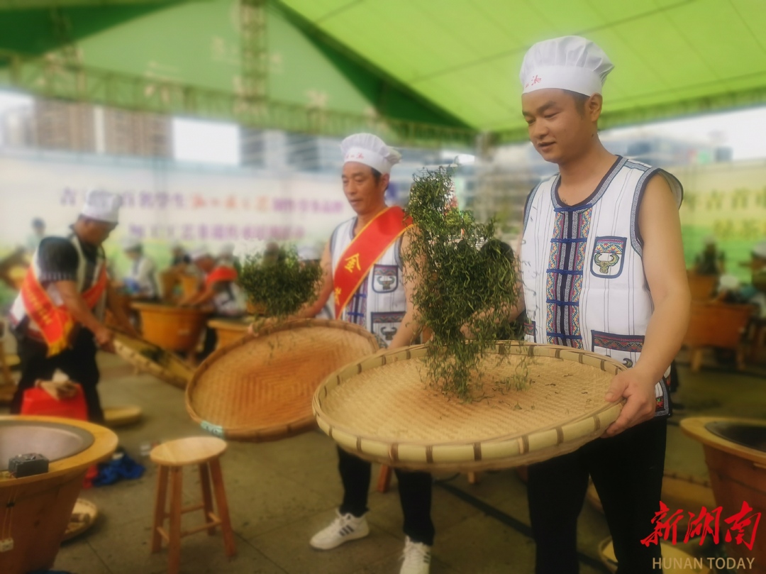 100口大铁锅摆放在吉首市人民广场,100名茶农带着刚采回的鲜叶,开始摊青。他们有的是种茶能手,有的是茶叶制作金奖获得者,更有国家级湘西黄金茶制作技艺非遗传承人。