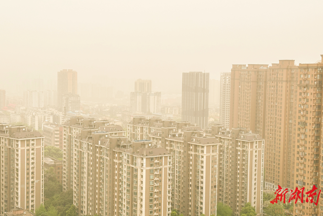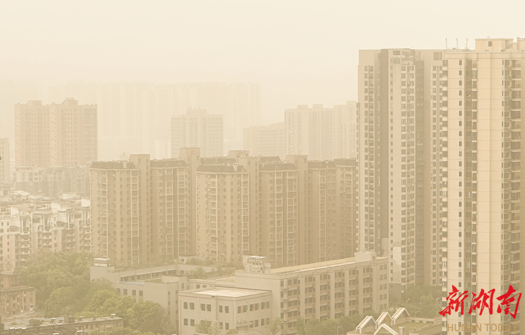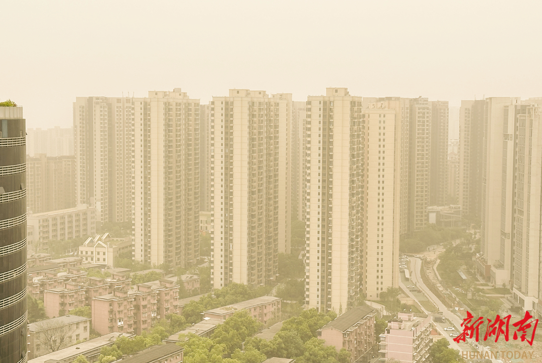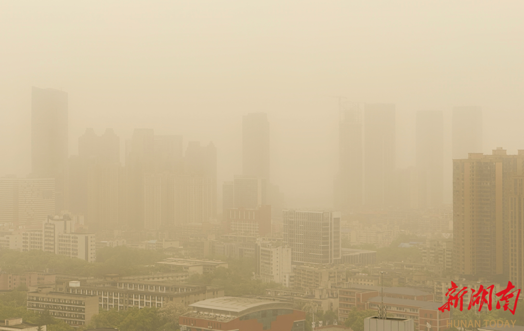 4月12日上午,受沙尘污染影响,长沙城区上空被沙尘气团笼罩,天色泛黄,能见度差。长沙市生态环境局温馨提示广大市民朋友,沙尘天气来临,做好防风防沙准备,及时关闭门窗;儿童、老年人和心脏病、肺病患者尽量停留在室内,停止户外运动,一般人群减少户外运动;注意携带口罩、纱巾等防尘用品,以免沙尘对眼睛和呼吸道造成损伤;做好精密仪器的密封工作;固紧围板、棚架及其他易被风吹动的搭建物,妥善安置易受风沙影响的室外物品;由于能见度较低,驾驶人员驾驶车辆时应控制速度,确保安全。湖南日报全媒体记者 徐行 摄