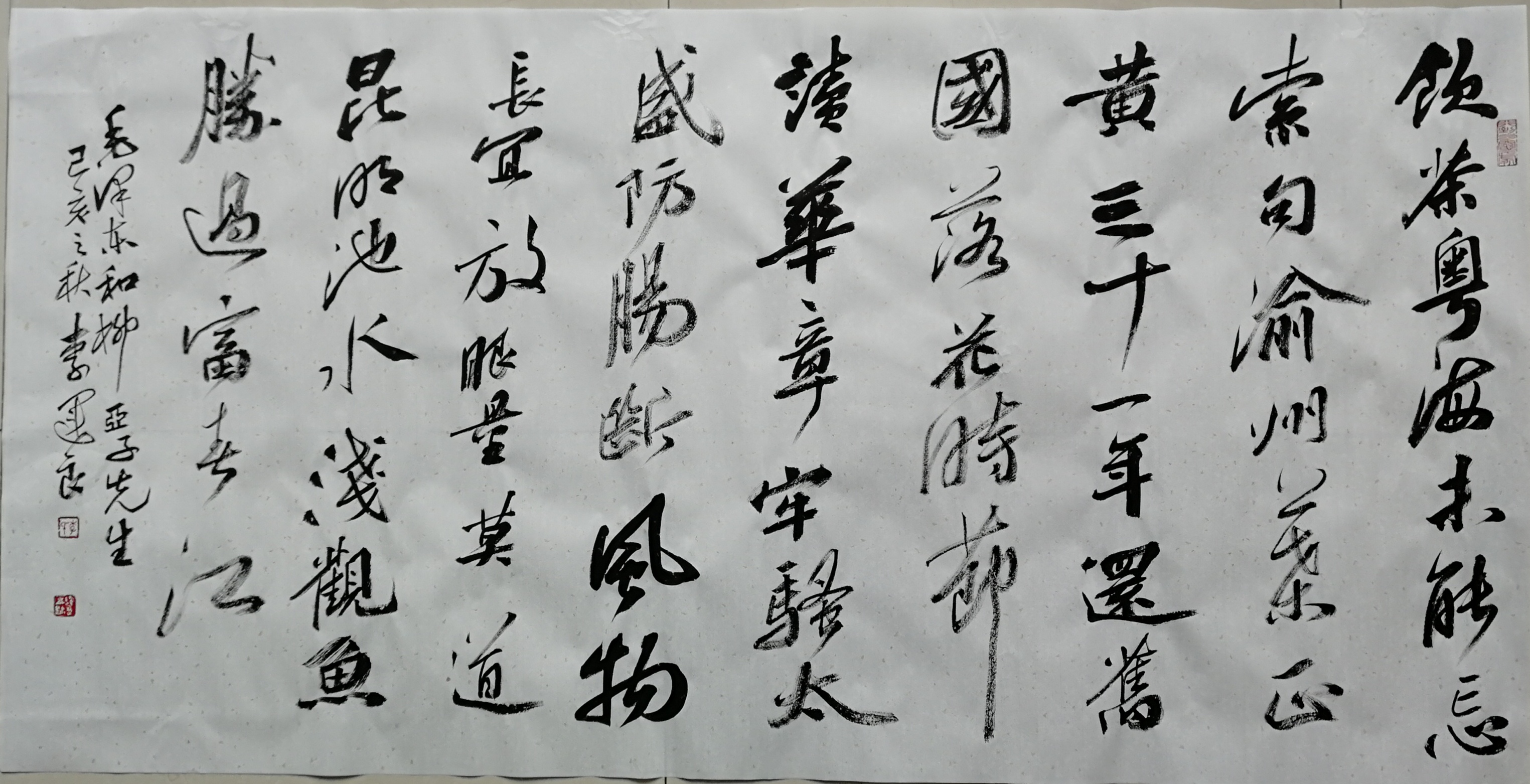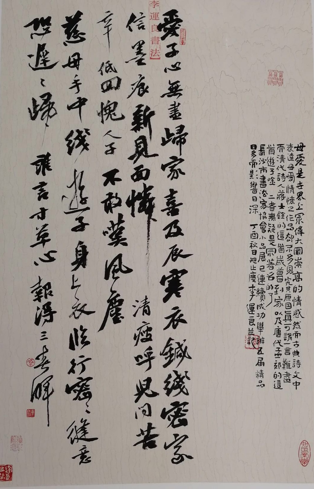 "李运良是长沙书法圈里有实力的人。运良学书走的是博学之路,楷书学习唐代楷书经典,柳公权的《玄秘塔》《神策军》颜真卿的《勤礼碑》《自书告身》等,都下过扎实的功夫。打下了良好的基础。之后再学《龙门二十品》,特别是北魏的《元怀墓志》,以增加其楷书的韵味。隶书学汉《曹全碑》《张迁碑》《石门颂》等,得严谨、朴茂、飘逸之风,再学汉简,更显灵动。行书主攻苏轼法帖,先由《中山松醪赋》《洞庭春色赋》入,再学其手札。其后也喜好王羲之和王铎的行书。兼而学之。他的苏体面目的行书,深受同道的赞誉,在长沙书坛独树一帜。这些年又攻草书,初以黄庭坚《李白忆旧游诗》《诸上座帖》为主,后上溯学怀素、张芝,用功甚勤,进步很快,已到可投国展去争席次的水平。"