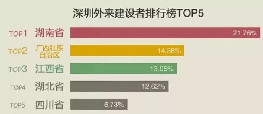 除广东省其他地方外,湖南省是深圳外来人口最大的来源地。据不完全统计:深圳的常住人口约2100万,其中外来人口1200万,而这之中,湖南人约350万左右,占比近30%。也就是说,在深圳每10个外地人中就有3个湖南人。