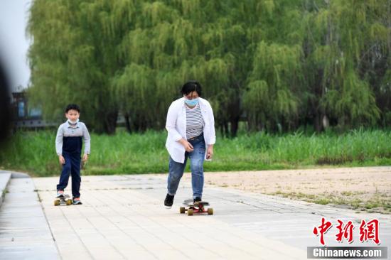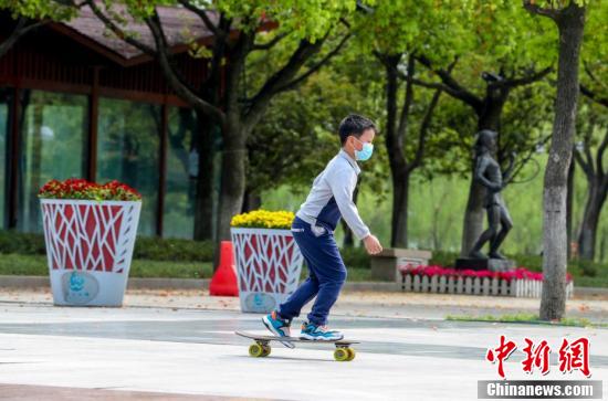 3月26日,武汉汉口江滩,小朋友在江边玩滑板。